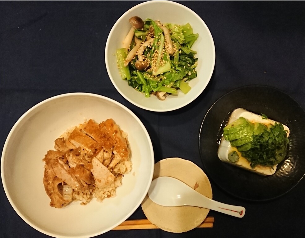 メインはチキンに下味を付け、最後に照り焼き、七味を振って、玄米の上に!